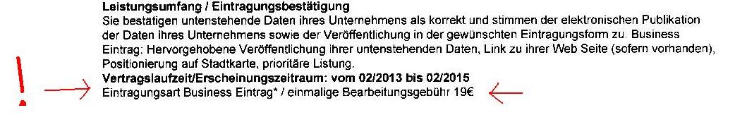 Im Branchenbuch Deutschland (Ausgabe?) 2013 sind bereits einige Kontaktdaten unvollständig hinterlegt. Gegen eine einmalige Bearbeitungsgebühr von 19,- Euro kann der Empfänger des Angebotes seine Kontaktdaten mittels des Anschreiben für das Branchenbuch Deutschland (für das / im Jahr 2013 ??) vervollständigen. Doch der Teufel steckt im Kleingedruckten, unter der Tabelle mit den unvollständigen Kontaktdaten.  – Oder?