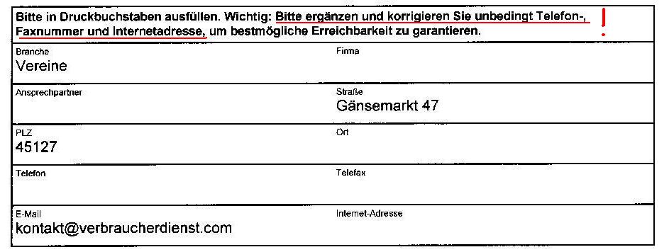 Zitat: “Bitte in Druckbuchstaben ausfüllen. Wichtig: Bitte ergänzen und korrigieren Sie unbedingt Telefon-, Faxnummer und Internetadresse, um bestmögliche Erreichbarkeit zu garantieren.“ – Zitat Ende